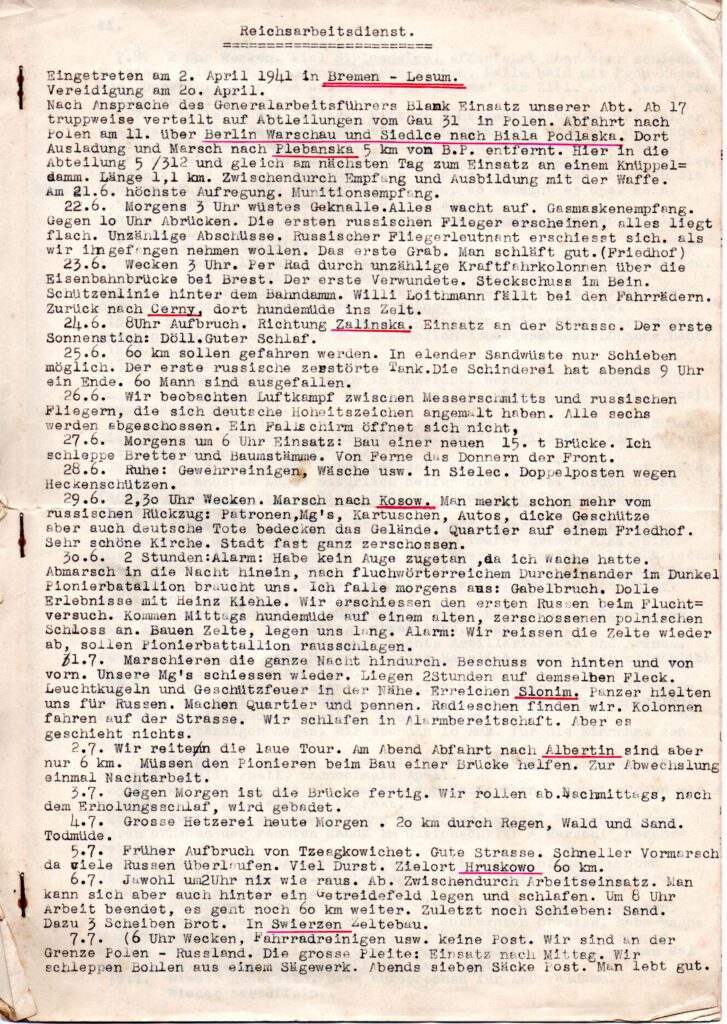 Der unbekannte Tagebuchschreiber ist am 2. April 1941 in Bremen-Lesum in den Reichsarbeitsdienst eingetreten. Nach einer kurzen Grundausbildung fand die Vereidigung am 20. April 1941 statt. Anschließend kam er dann zur Abteilung 5/312 in Polen in die Nähe der damaligen russischen Grenze bei Brest. Bei seinem ersten Einsatz musste er beim Bau eines Knüppeldamms helfen. Am 21. Juni 1941 – dem Tag vor Beginn des Überfalls auf die Sowjetunion – hat er dann Munition empfangen. Dies zeigt, dass der RAD auch militärisch hinter den Truppen der Wehrmacht tätig war! Unser unbekannter Schreiber war also ab dem ersten Tag am Überfall auf die Sowjetunion beteiligt. In den folgenden Monaten bis November 1941 war er mit seiner Einheit, wohl einer Radfahrtruppe, bis in die heutige Ukraine unterwegs. Während dieser Zeit war er an Bauarbeiten, wie z.B. dem Bau von Knüppeldämmen oder der Entschlammung von Straße beteiligt. Auch berichtet er, wie er auf Menschen geschossen hat.